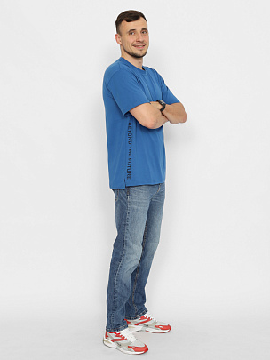 Футболка мужская оверсайз из кулирной глади. С рукавом до локтя. Воротник из эластичной рибаны. На полочке декоративный принт (ЗА ГРАНЬЮ БУДУЩЕГО). Удлиненная спинка, разрезы по бокам.